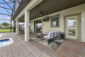 Our backyard is your private oasis. Enjoy lounging in the sun, taking a refreshing swim in the large pool, or relaxing in the hot tub. The outdoor seating area is perfect for dining al fresco, making the most of Florida’s beautiful weather.